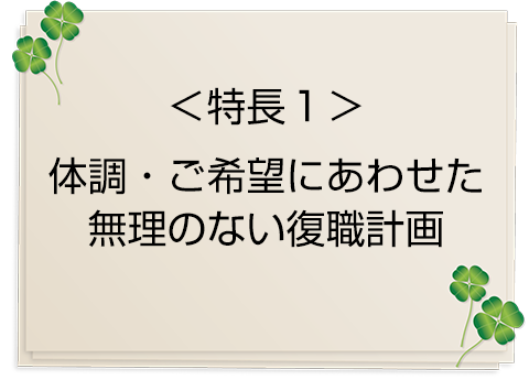 復職に向けて、いつ職場復帰を目指すのか、どのような訓練を行うのかなど、職場復帰までの具体的な復職計画(個別支援計画)をごいっしょに考えていきます。同じ時間に決まったところに来ることで体のリズム作りをすることもできます。