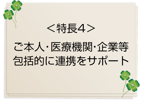 ご希望を伺いながら、医療機関や企業と連携を取り、サポート致します。