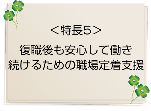 復職後も定期的にご本人との面談を行い、職場の様子だけでなく生活リズムや疲労のコントロール状況等を確認します。また、必要に応じて、職場訪問や企業担当者との面談も行い、職場環境の確認や職務の再設計相談などをサポートします。